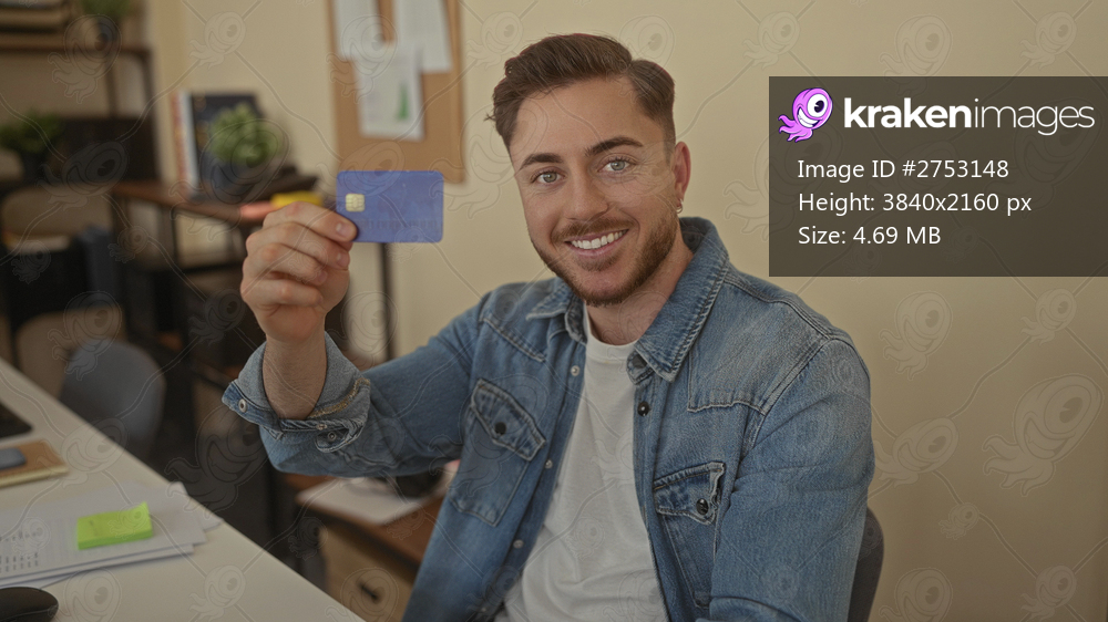 Young man with beard holding credit card in indoor office setting showcasing finance and technology in professional environment with casual attire and modern workspace. - Kraken Images