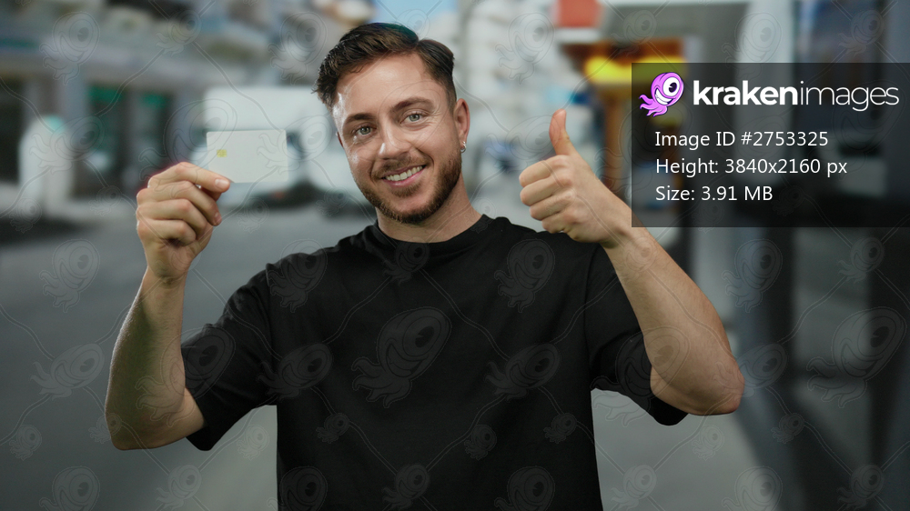 Young man with beard holding credit card and showing thumbs up on city street implying financial confidence and success outdoors.