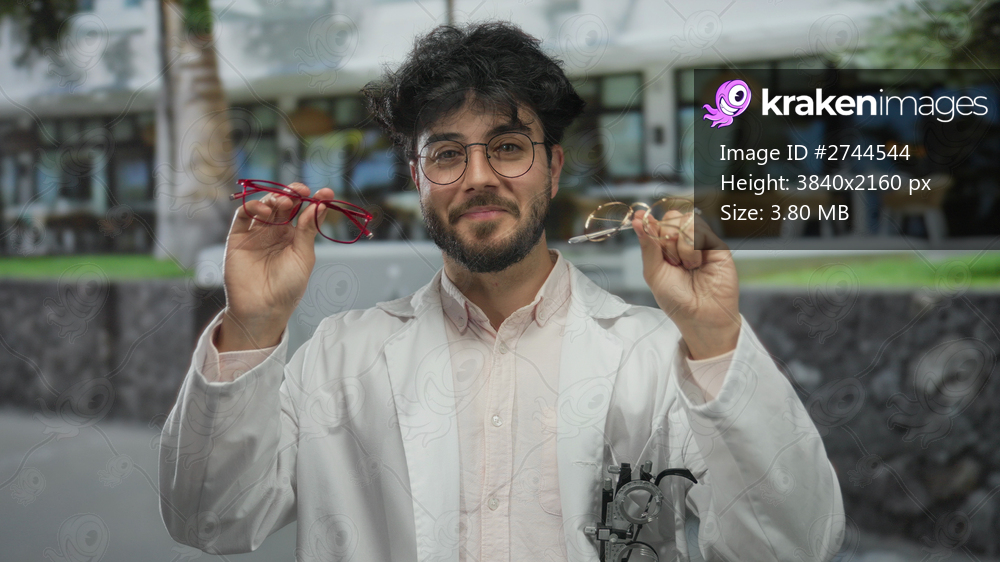 Young man with beard holding eyeglasses outdoors on a sunny day in a casual setting with a hint of concern on his face for choosing which frame fits best in the bright sunlight - Kraken Images