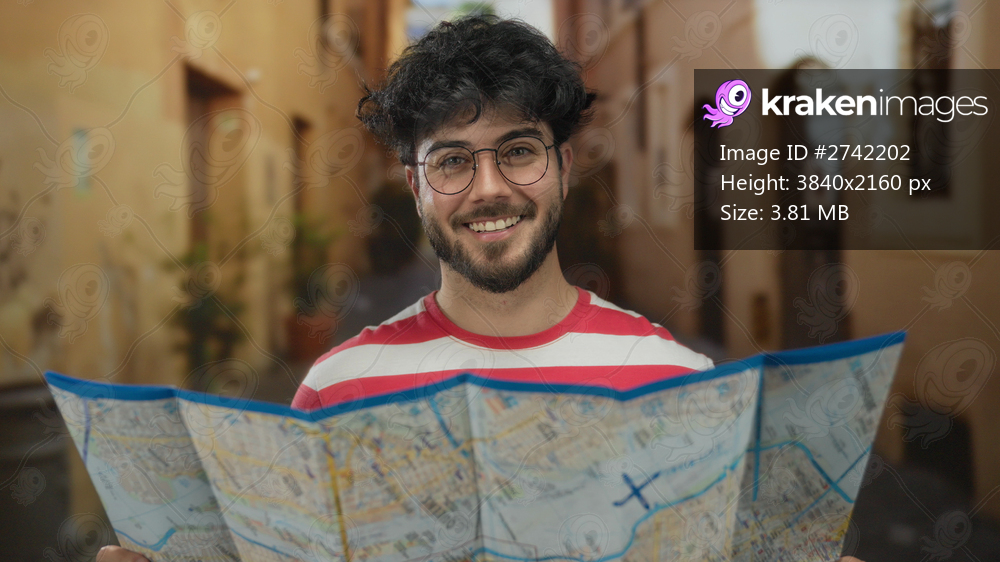 Young man with beard holding map outdoors in a rustic street smiling, embodying adventure and exploration.