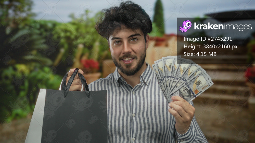 Young man with beard holding shopping bag and us dollars outdoors on sunny day smiling happily in garden setting