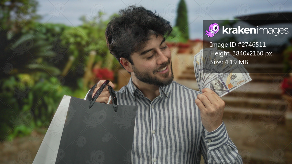 Young man with beard holding shopping bag and us dollars outdoors on sunny day smiling happily in garden setting