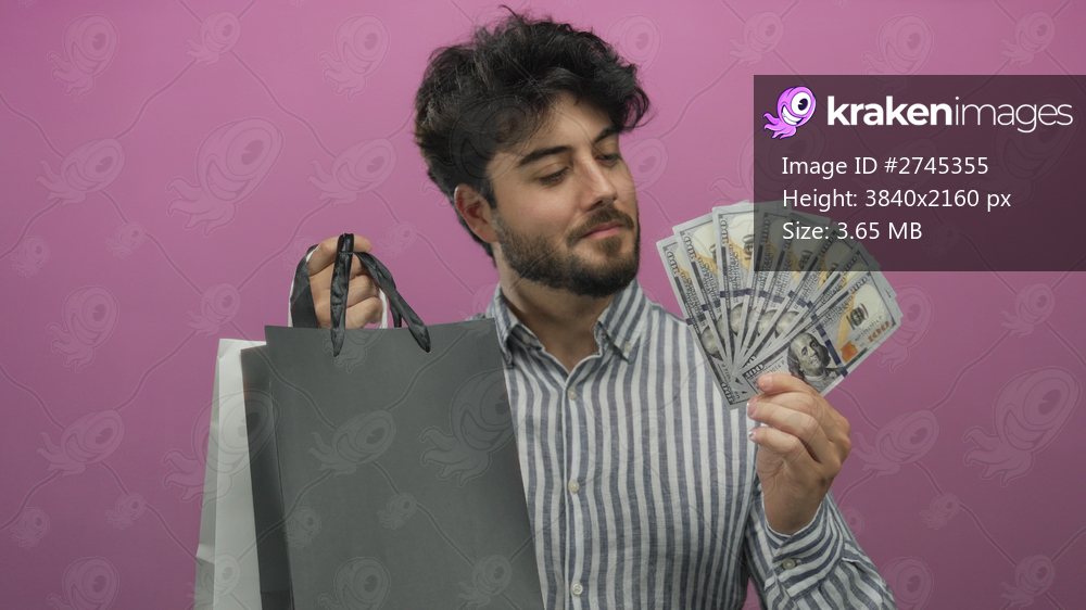 Young man with beard holding shopping bags and fan of us dollars against pink background indicating shopping success and wealth