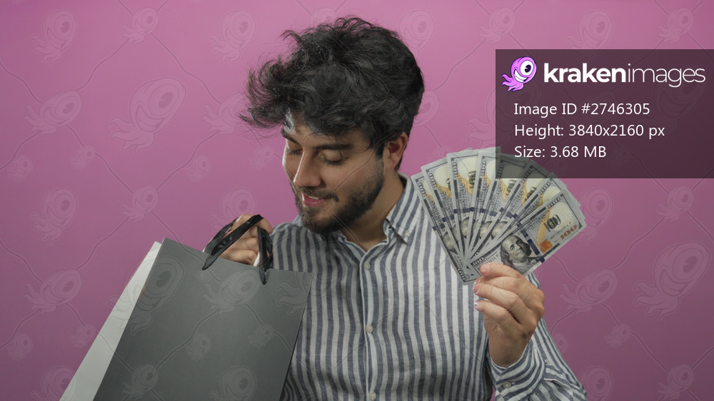 Young man with beard holding shopping bags and fan of us dollars against pink background indicating shopping success and wealth