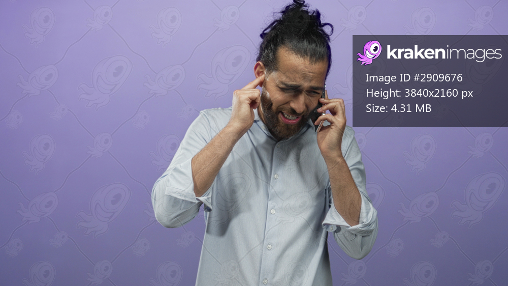 Young man with beard holding smartphone to ear while plugging ears with fingers in purple studio; frustration.