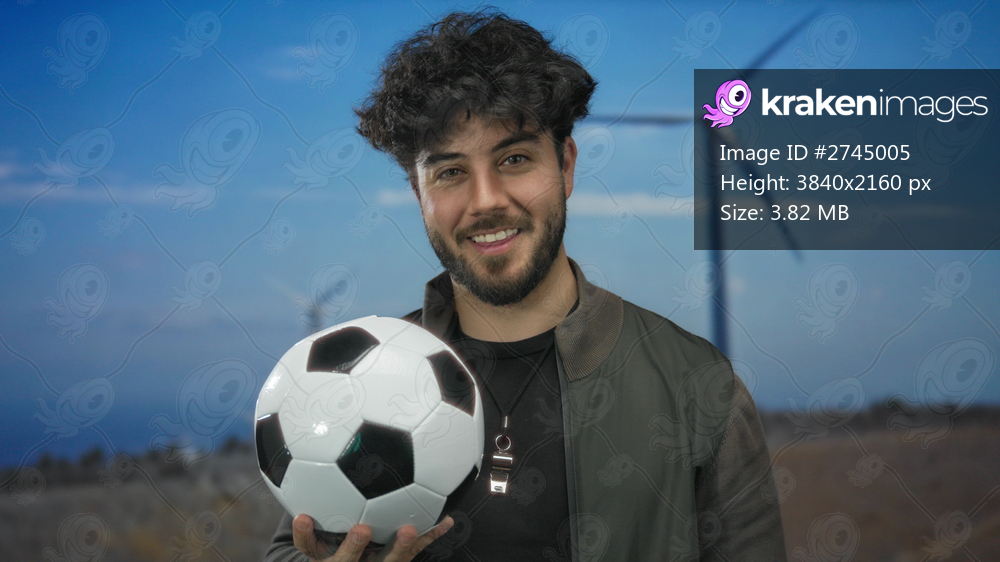 Young man with beard holding soccer ball in front of windmill in outdoor field setting with clear sky.
