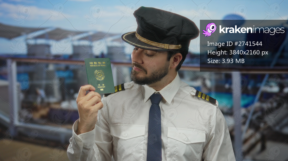 Young man with beard holding south korean passport on cruise ship deck wearing captain uniform and hat under blue sky.