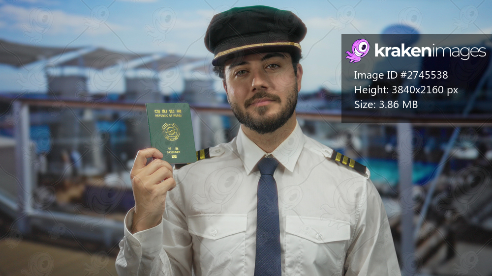 Young man with beard holding south korean passport on cruise ship deck wearing captain uniform and hat under blue sky.