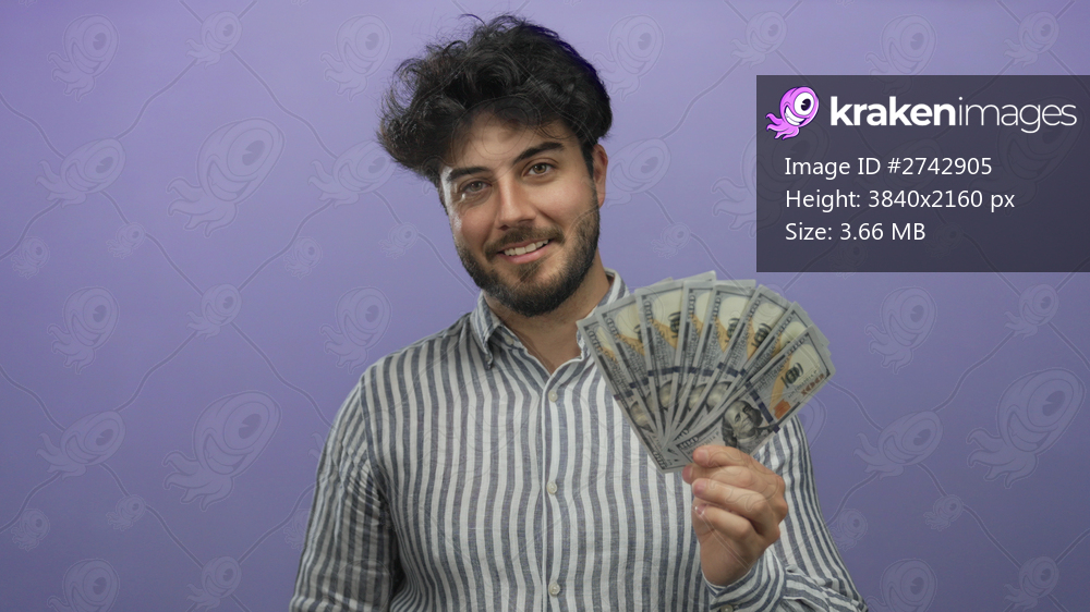 Young man with beard holds us dollars against a vibrant purple background, exuding confidence and success in a financial context.