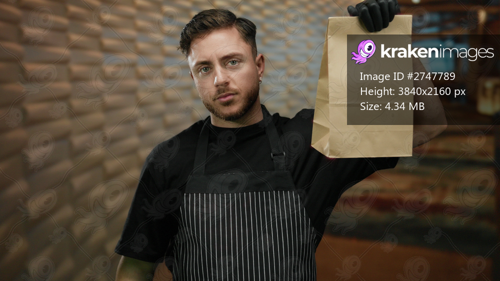 Young man with beard in apron holding paper bag in hotel interior as waiter with glove and focused expression demonstrating take away service.