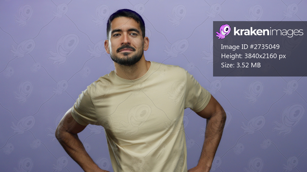 Young man with beard in beige shirt standing against purple background with hands on hips, exuding confidence and charm in a modern minimalist portrait. - Kraken Images