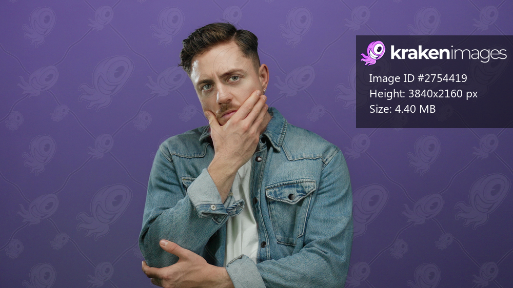 Young man with beard in denim jacket pondering against a vibrant purple background exemplifies thoughtful contemplation and casual style in an isolated setting - Kraken Images