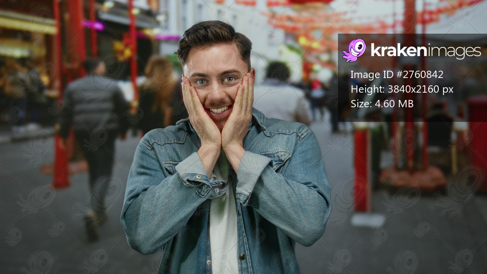 Young man with beard in denim jacket smiling and covering face on bustling city street filled with people and vibrant decorations suggesting an urban outdoor scene. - Kraken Images