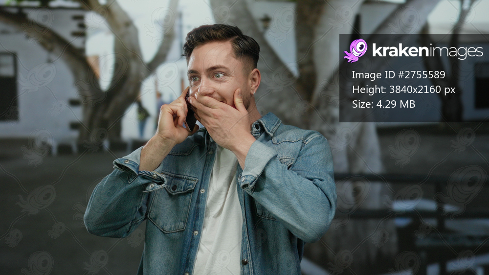 Young man with beard in denim jacket talking on phone outside in park with white buildings and trees blurred in background expressing happiness.
