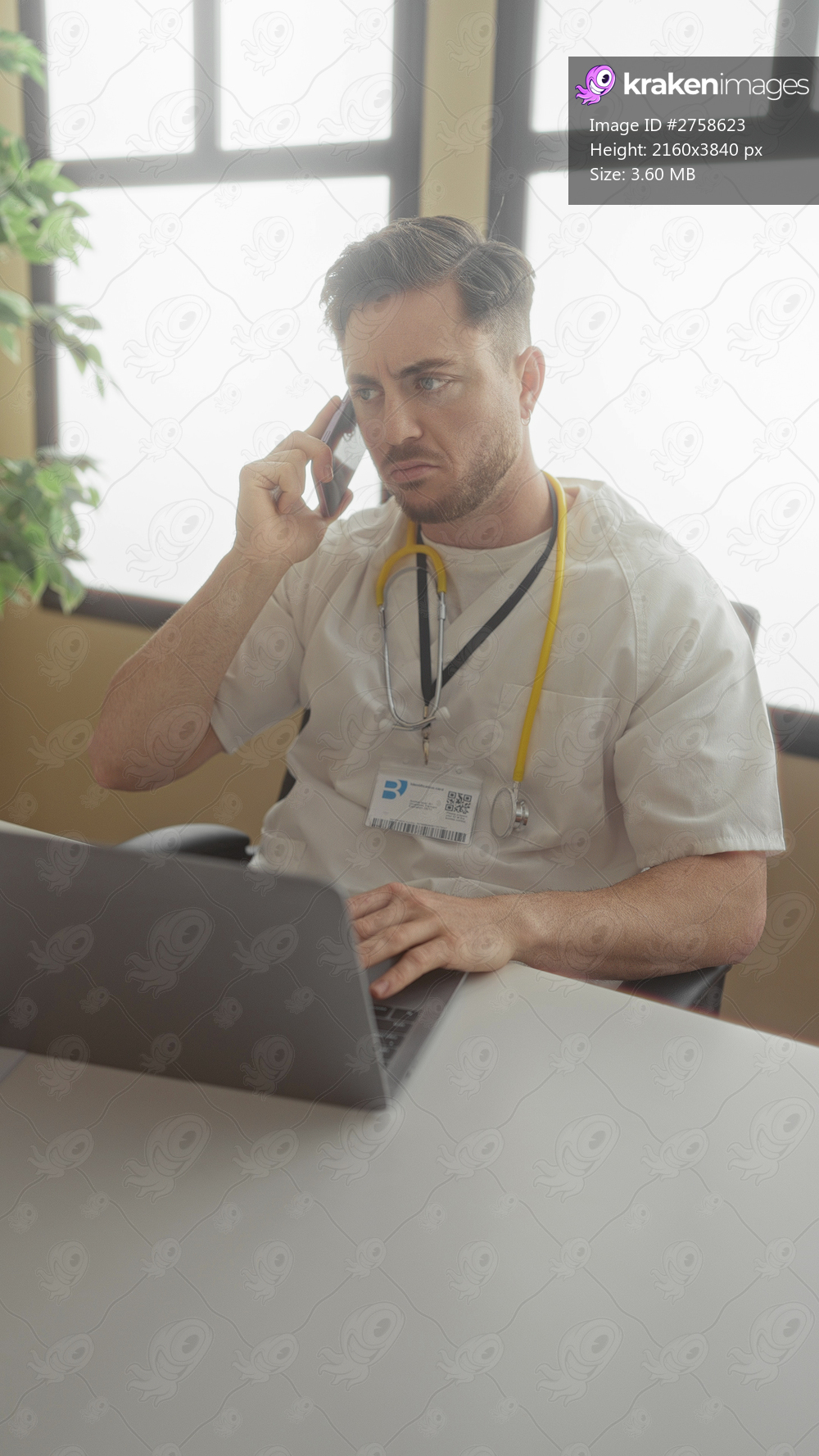 Young man with beard in hospital room talking on phone with laptop and stethoscope showcasing his profession as a doctor in a medical workplace indoors. - Kraken Images