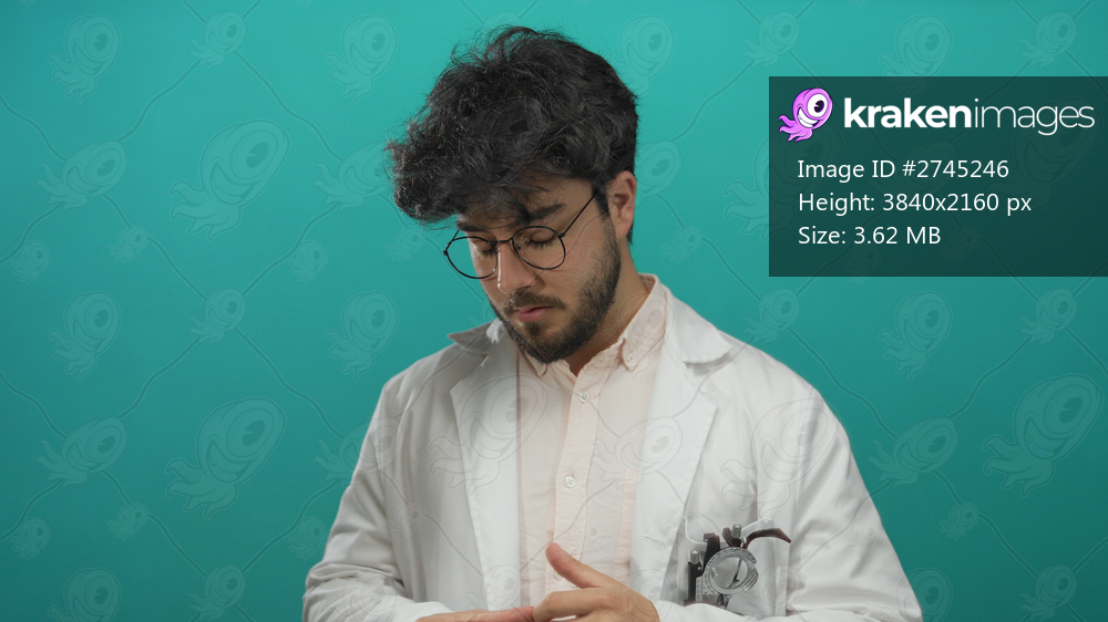 Young man with beard in lab coat deep in thought against blue background portraying a serious expression associated with scientific study or research setting context - Kraken Images