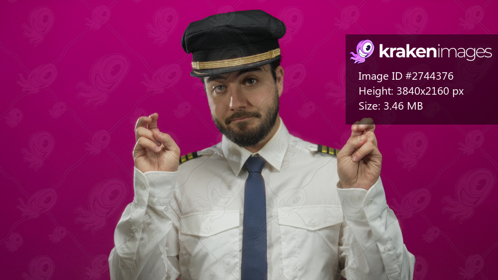 Young man with beard in pilot uniform making gesture against pink background, conveying sarcasm and humor in a playful setting.