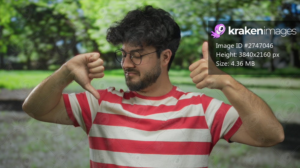 Young man with beard in striped shirt making thumbs up and down gestures in a green park outdoors reflecting mixed feelings and emotions.