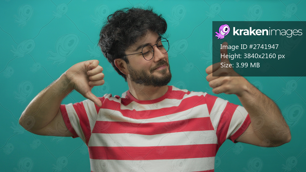 Young man with beard in striped shirt showing thumbs up and thumbs down against green background, expressing mixed reactions with a thoughtful look.