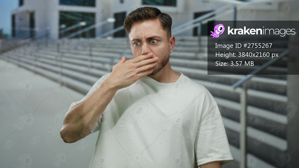 Young man with beard in white shirt on city street appears surprised covering mouth while standing outdoors by modern building steps