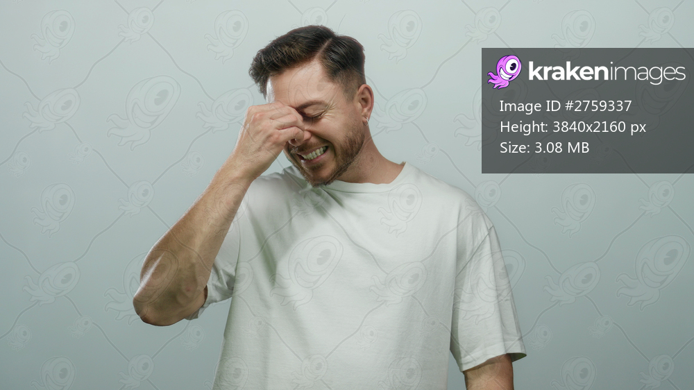 Young man with beard in white shirt pinching bridge of nose while standing against plain white background showing expression of frustration and contemplation. - Kraken Images