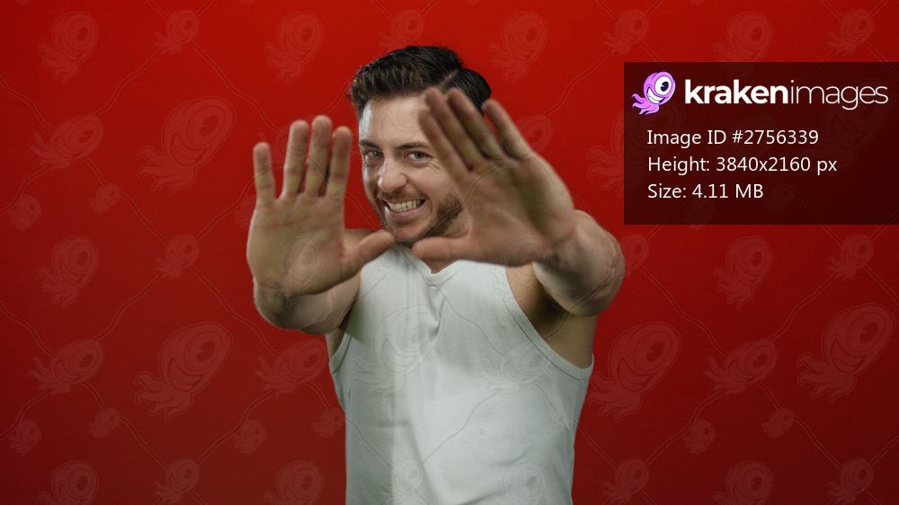 Young man with beard in white tank top playfully covering face with hands against vibrant red background, expressing excitement or joy in isolated setting. - Kraken Images