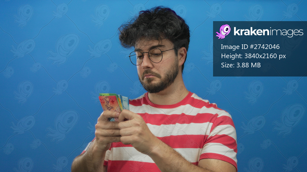 Young man with beard inspecting swiss francs against a vibrant blue background, wearing a striped shirt and glasses, conveying focus and contemplation. - Kraken Images