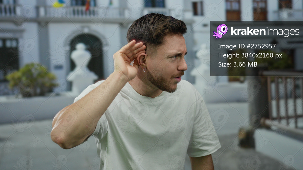 Young man with beard listening on city street appearing curious in outdoor urban environment wearing casual white shirt with blurred background