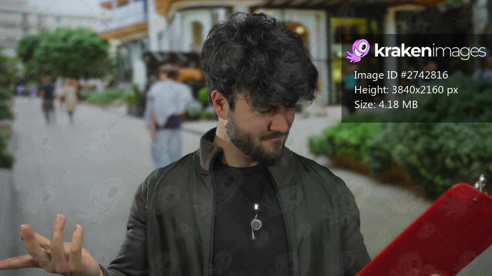 Young man with beard looking frustrated holding a red clipboard outdoors on crowded street with shops in the background, showcasing urban scene.