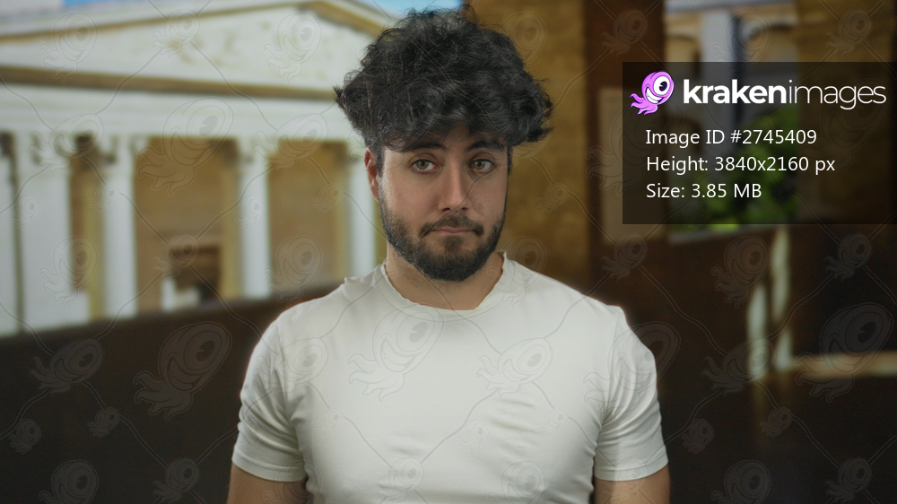 Young man with beard looks skeptical while standing in an old university outdoor setting with historic architecture in the background.
