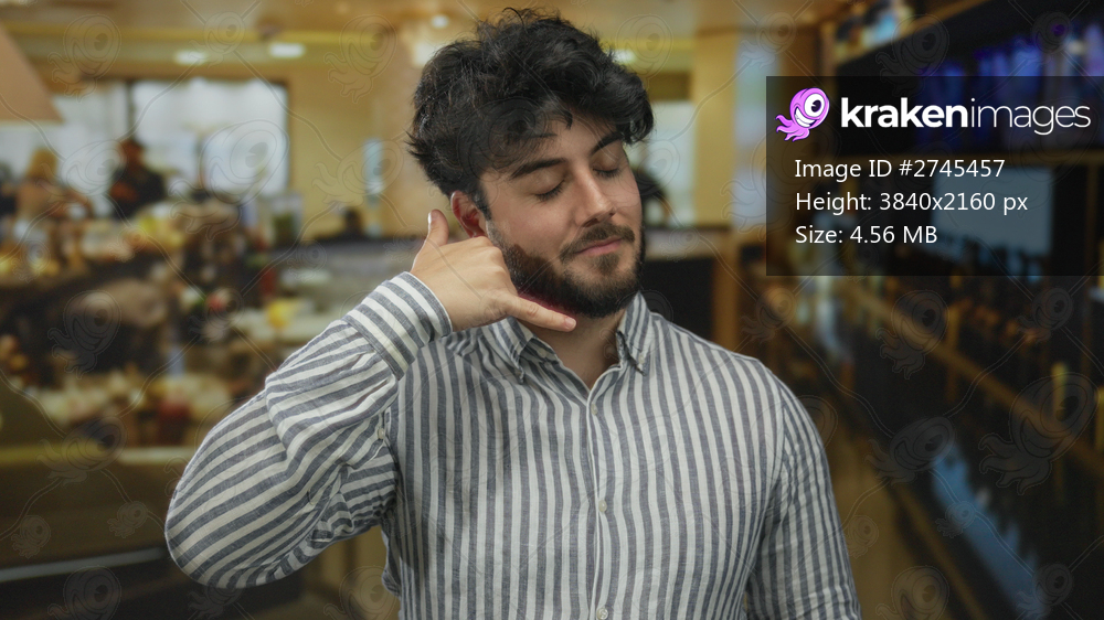 Young man with beard makes call gesture in lively restaurant ambiance suggesting friendly communication in a relaxed indoor setting with coffee and hispanic cultural nuances. - Kraken Images
