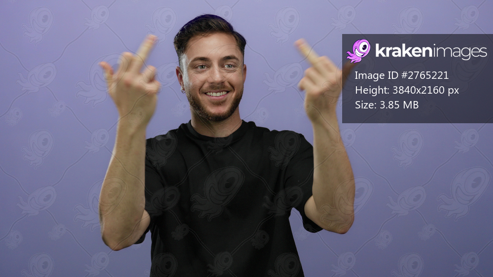Young man with beard makes gestures with middle fingers while smiling, standing against isolated purple background.