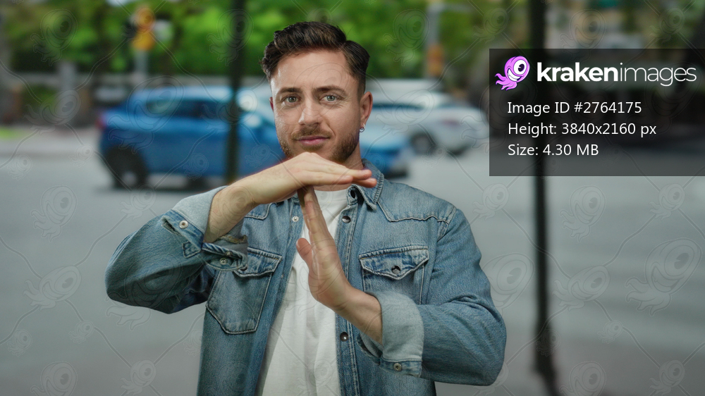 Young man with beard makes hand gesture on city street with cars blurred in background during daytime outdoor scene in urban environment