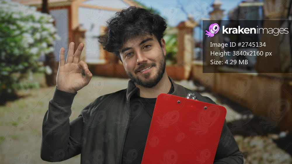 Young man with beard making ok gesture with hand while holding red clipboard in outdoor park setting, surrounded by green foliage and sunny atmosphere, showcasing positive expression. - Kraken Images