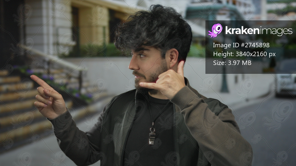 Young man with beard making phone gesture and pointing outdoors on city street, expressing communication and interaction.