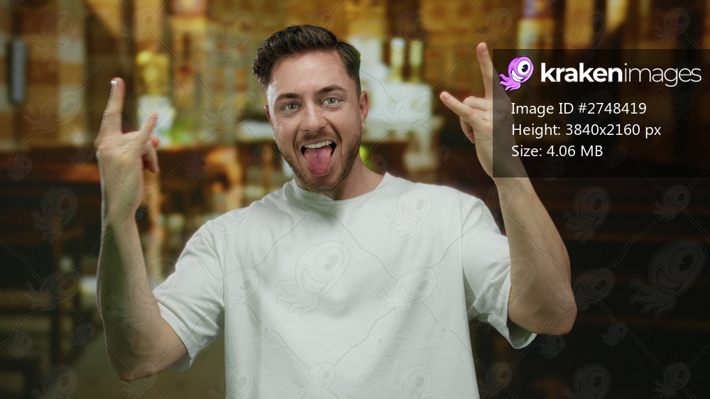 Young man with beard making rock gesture inside church wearing white shirt showing excitement and expression in unusual indoor setting.