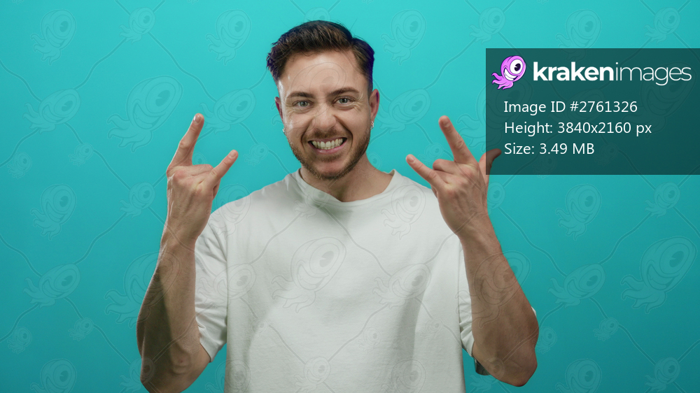 Young man with beard making rock hand gestures smiles confidently against a vibrant blue background, showcasing energy and youthfulness.