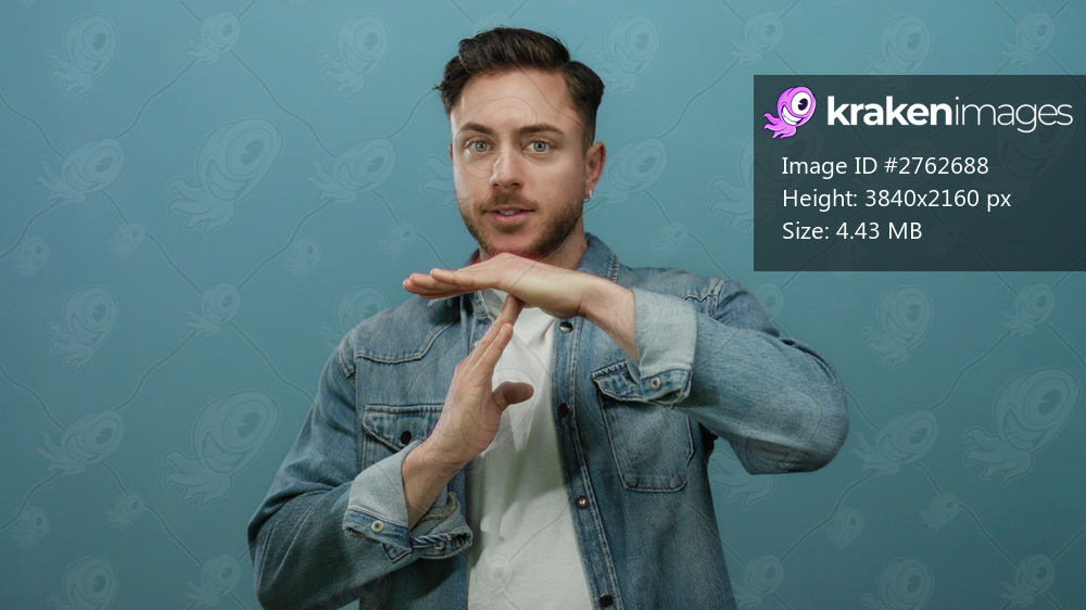 Young man with beard making timeout gesture against isolated blue background, wearing a denim shirt, expressing need for break or pause, conveying emotion with facial expressions and hand sign. - Kraken Images