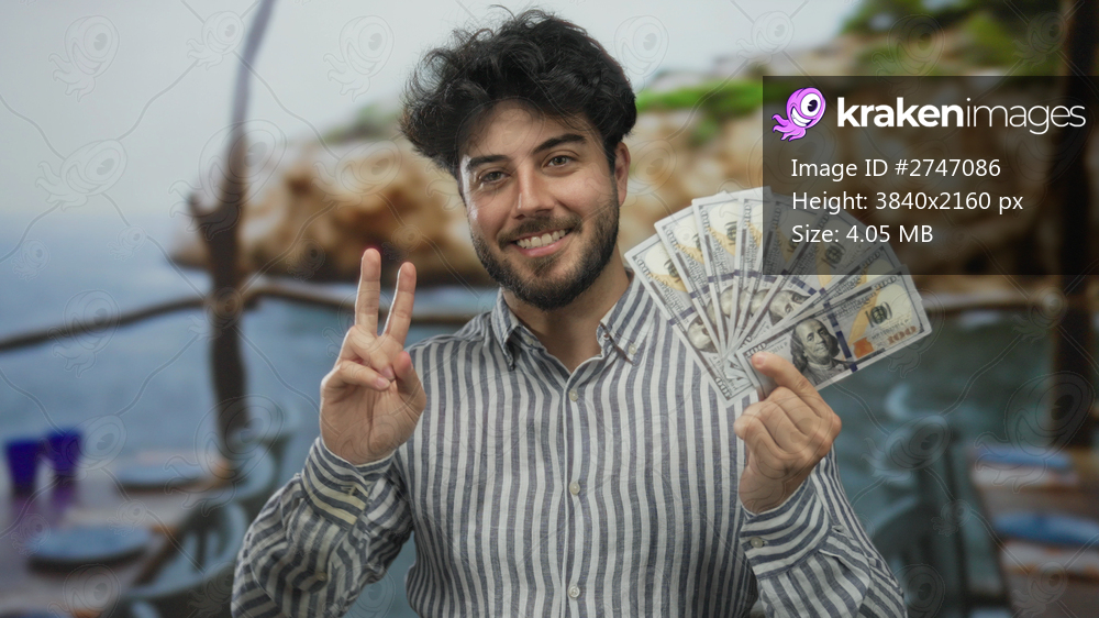 Young man with beard making victory gesture holding us dollars on restaurant terrace by the sea.