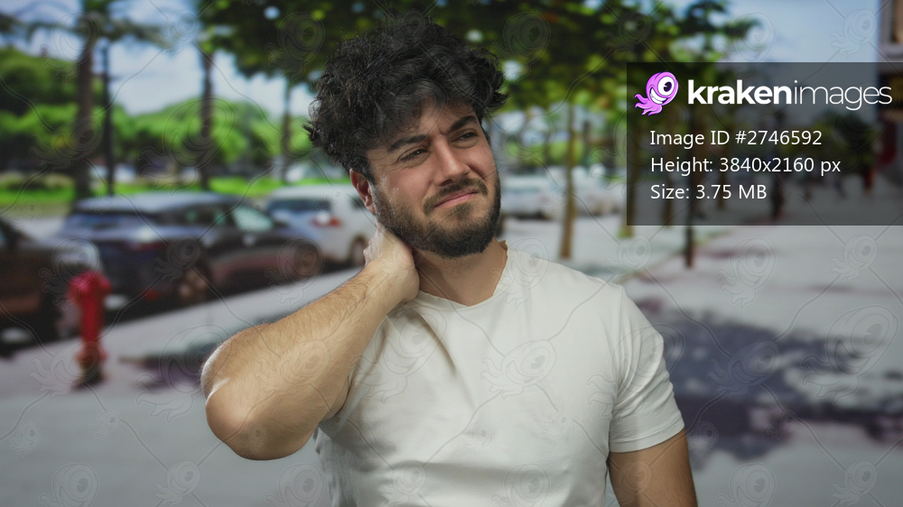 Young man with beard outdoors holding sore neck on sunny street background suggesting discomfort or pain in a casual urban setting.