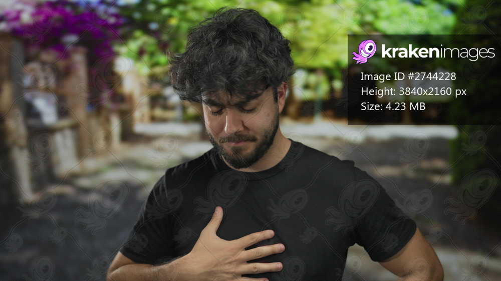 Young man with beard outdoors in a park, wearing black shirt, appears pensive with green foliage in background under bright natural sunlight.