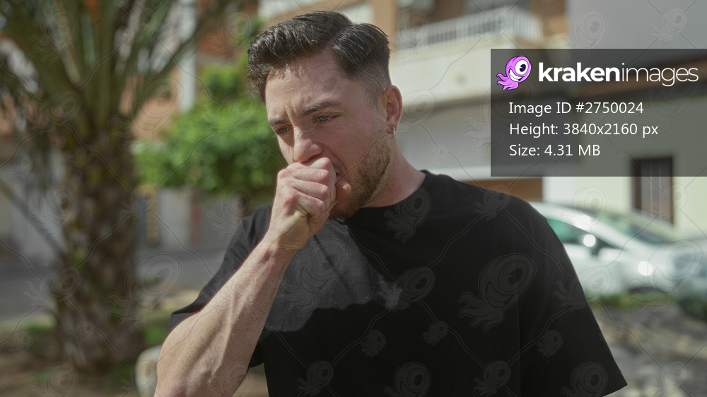Young man with beard outdoors in city street coughing into fist while standing in front of buildings and parked cars during daylight.