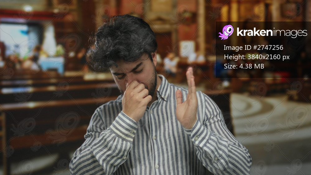 Young man with beard pinches nose due to bad smell indoors in a church, highlighting discomfort in this indoor religious setting.