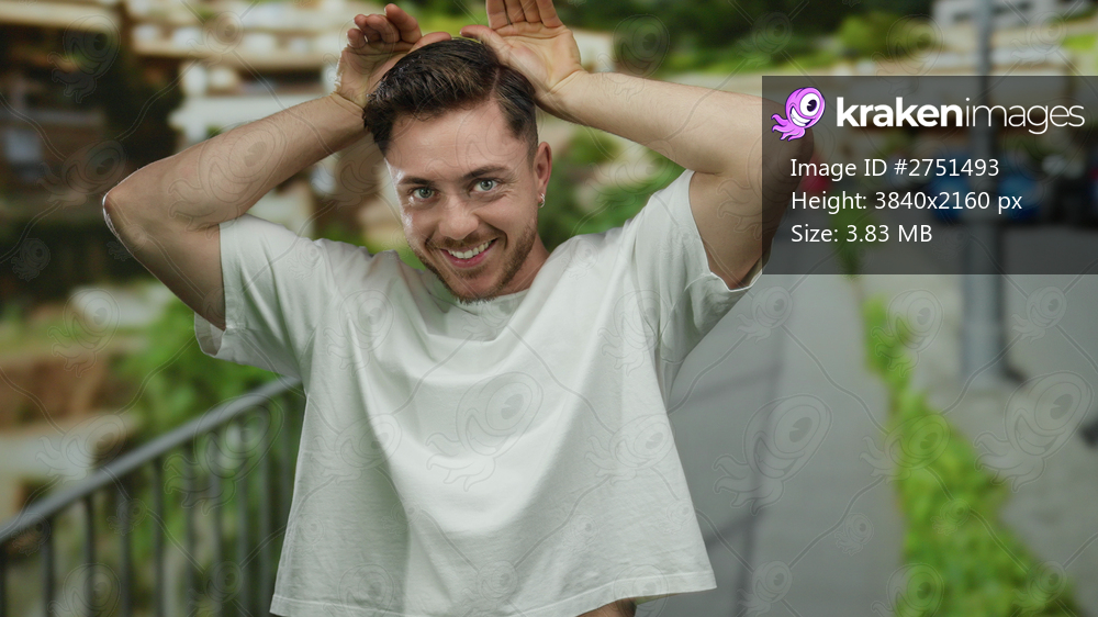 Young man with beard playfully posing on city street outdoors in bright daylight enjoying surroundings.