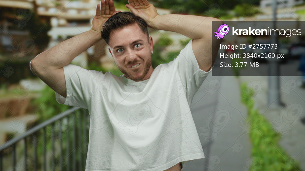 Young man with beard playfully posing on city street outdoors in bright daylight enjoying surroundings.