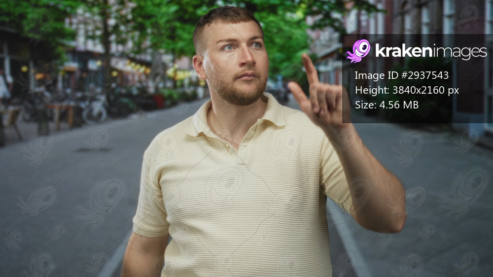 Young man with beard points index finger forward on street, forearm raised, wearing beige polo shirt and focused gaze; determination.