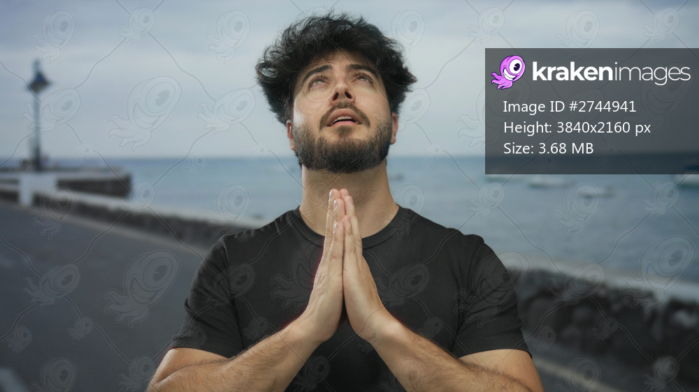 Young man with beard prays outdoors on seaside promenade showing devotion amidst the tranquil backdrop of the ocean under a cloudy sky.