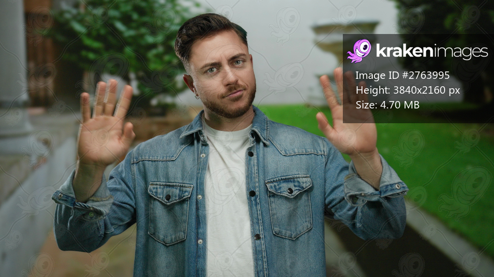 Young man with beard raises hands in an outdoor city street setting, wearing denim jacket, expressing gesture with a thoughtful look, surrounded by lush greenery and urban architecture. - Kraken Images
