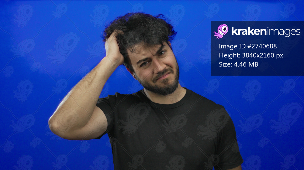 Young man with beard scratching head against vibrant blue background looking confused thoughtful contemplative expression pondering casual clothing dark hair. - Kraken Images