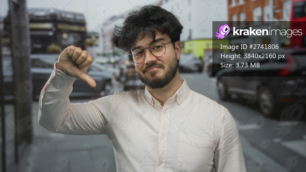 Young man with beard showing thumbs down gesture outdoors on busy street with cars and buses in background, wearing glasses and white shirt in urban setting. - Kraken Images